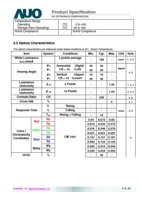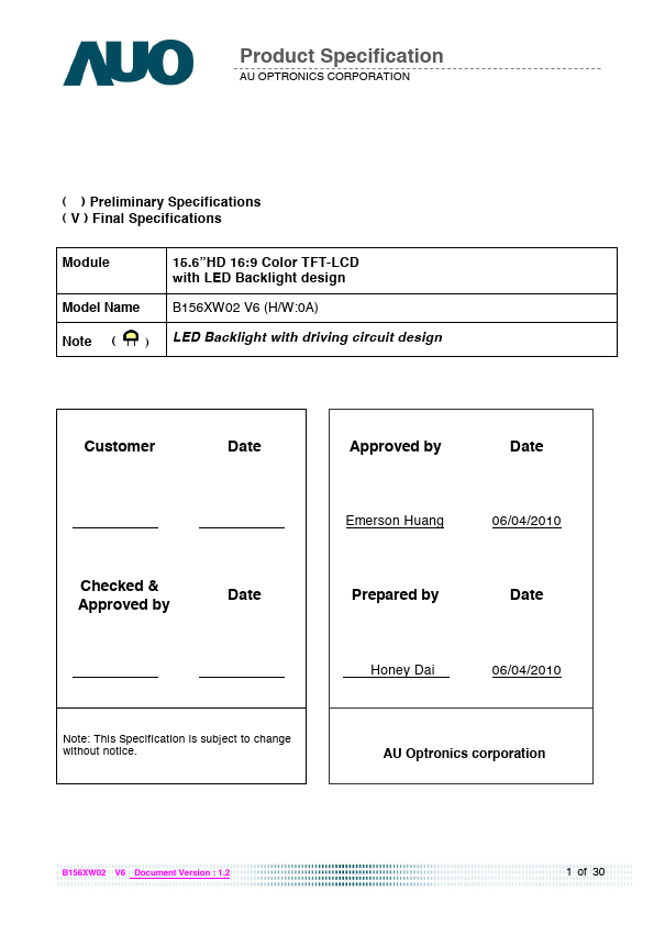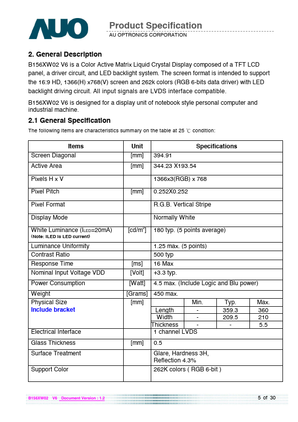 B156XW02 V6 is a Color Active Matrix Liquid Crystal Display posed of a TFT LCD panel, a driver circuit, and LED backlight system. The screen format is intended to support the 16:9 HD, 1366(H) x768(V) screen and 262k colors (RGB 6-bits data driver) with LED backlight driving circuit. All input signals are LVDS interface patible.