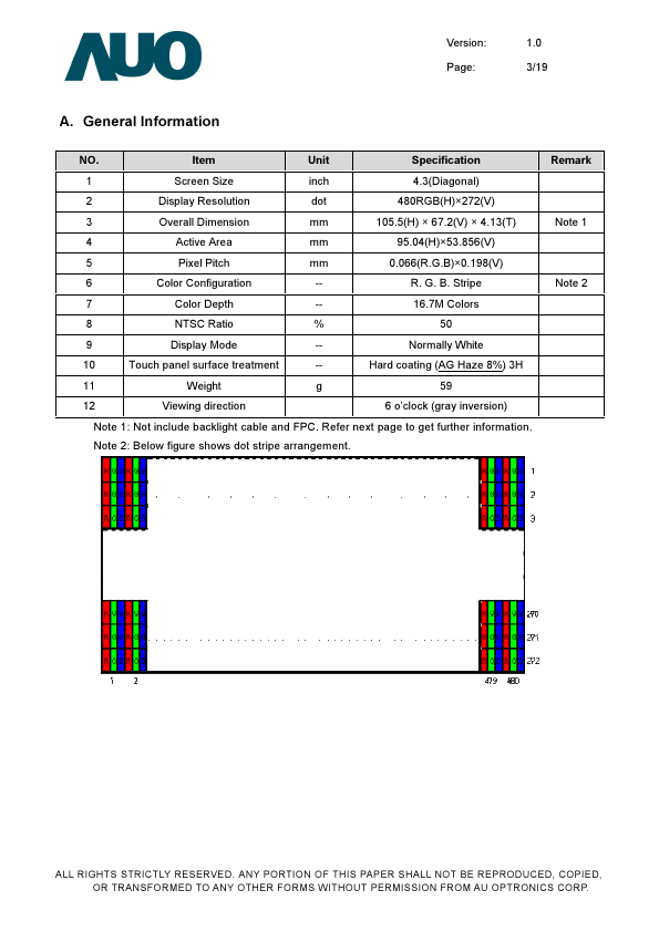 5/19 Remark ALL RIGHTS STRICTLY RESERVED. ANY PORTION OF THIS PAPER SHALL NOT BE REPRODUCED, COPIED, OR TRANSFORMED TO ANY OTHER FORMS WITHOUT PERMISSION FROM AU OPTRONICS CORP.