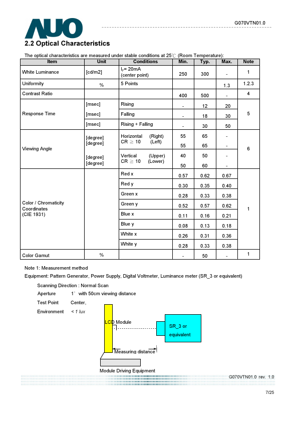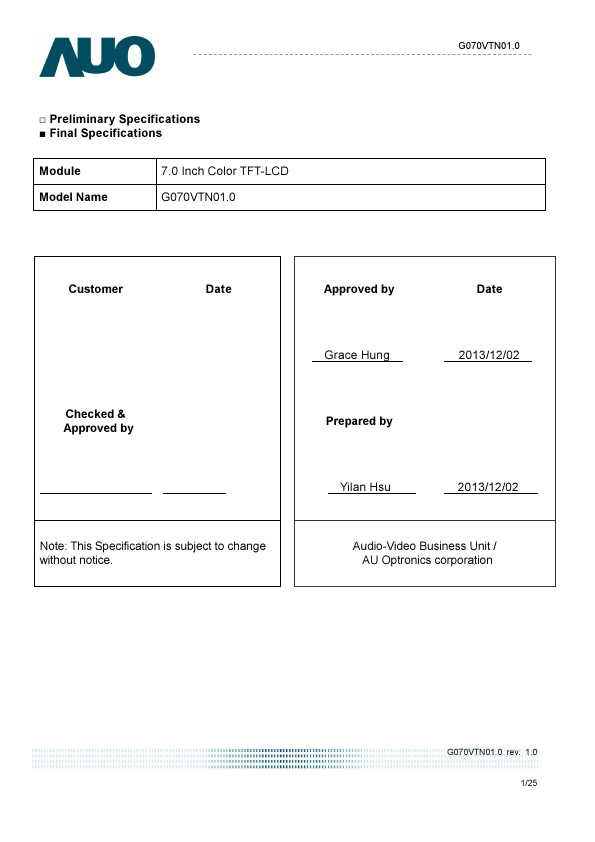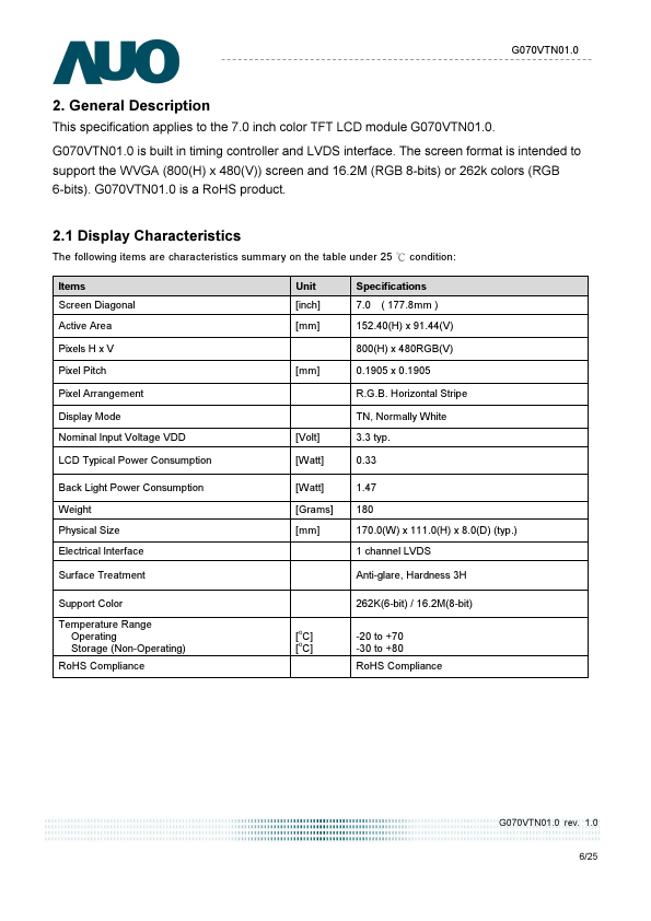 This specification applies to the 7.0 inch color TFT LCD module G070VTN01.0. G070VTN01.0 is built in timing controller and LVDS interface. The screen format is intended to support the WVGA (800(H) x 480(V)) screen and 16.2M (RGB 8-bits) or 262k colors (RGB 6-bits).