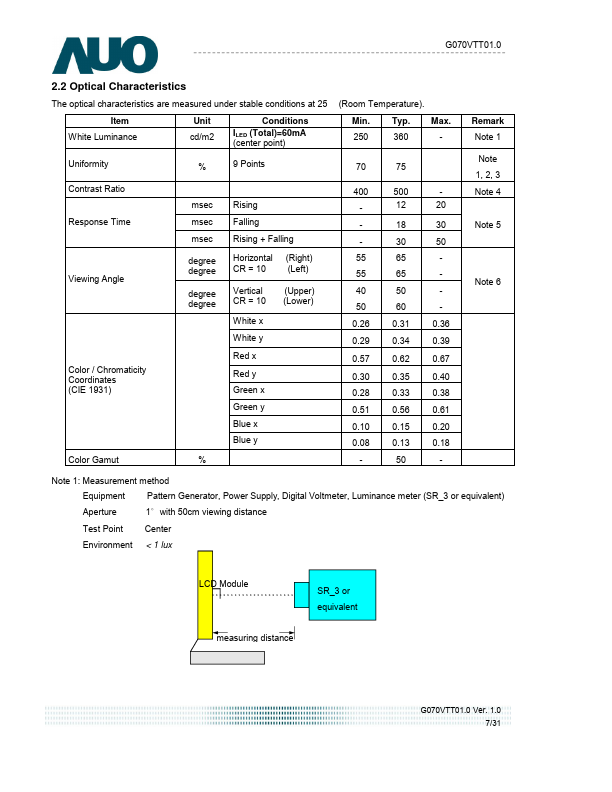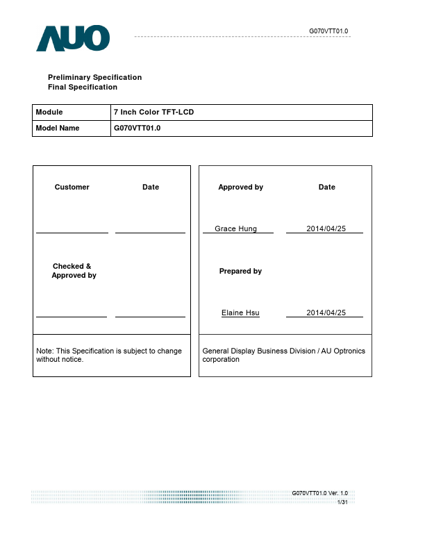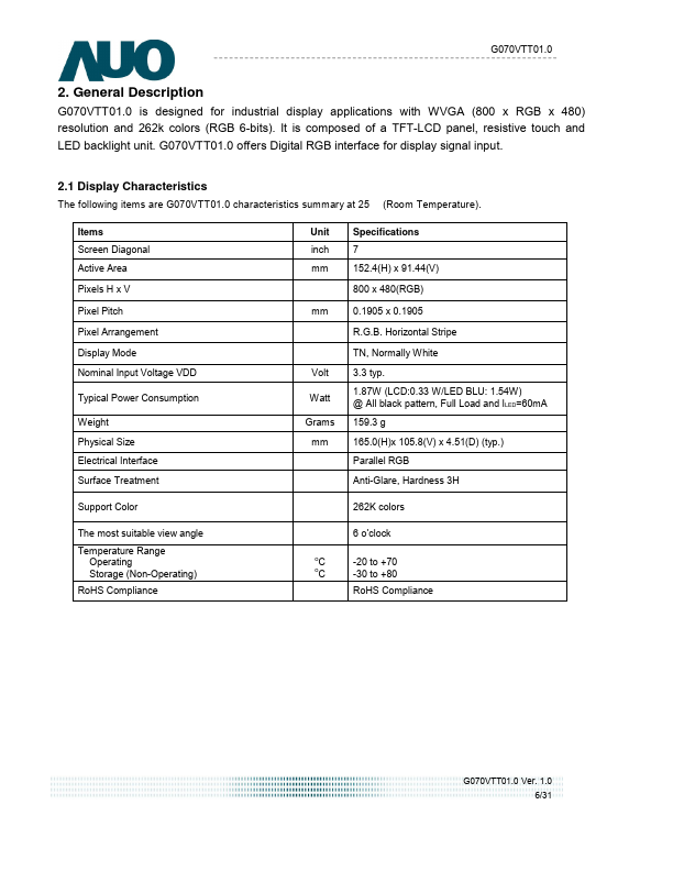 G070VTT01.0 is designed for industrial display applications with WVGA (800 x RGB x 480) resolution and 262k colors (RGB 6-bits). It is posed of a TFT-LCD panel, resistive touch and LED backlight unit. G070VTT01.0 offers Digital RGB interface for display signal input.