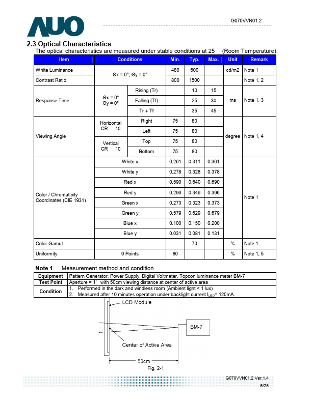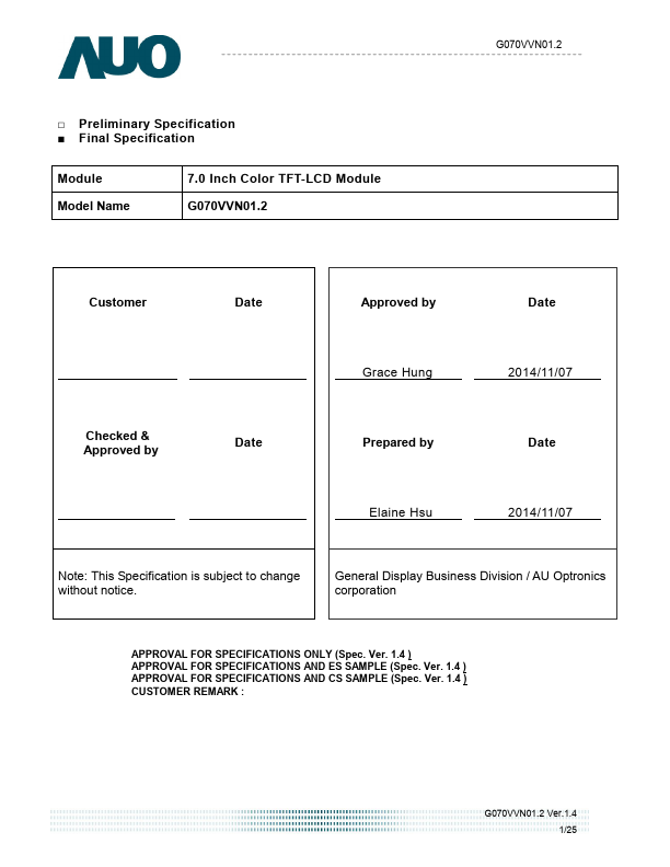 This specification applies to the 7.0 inch color TFT LCD with AMVA (Advanced MVA) technology module G070VVN01.2. It posed of a TFT-LCD panel, driver ICs, PCB with power supply circuit and backlight unit. The screen format is intended to support the WVGA (800(H) x 480(V)) screen and 16.2M (8-bits) or 262k colors (6-bits) by digital RGB interface.
