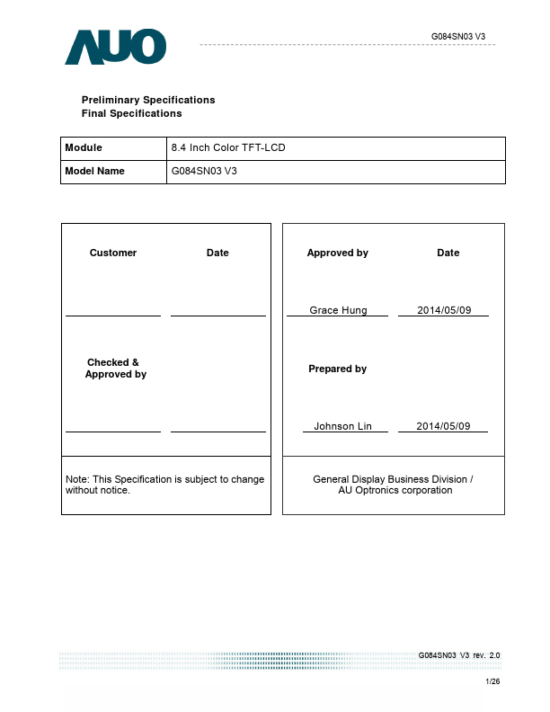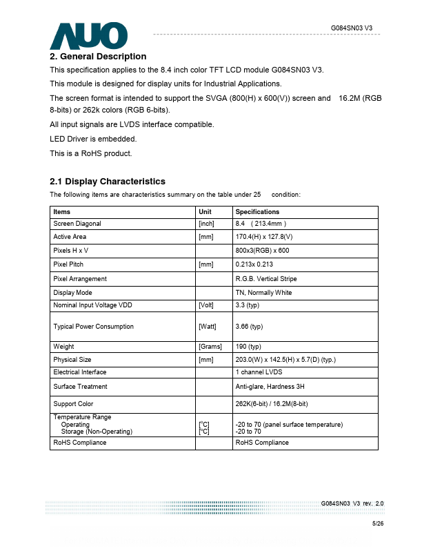 This specification applies to the 8.4 inch color TFT LCD module G084SN03 V3. This module is designed for display units for Industrial Applications. The screen format is intended to support the SVGA (800(H) x 600(V)) screen and 16.2M (RGB 8-bits) or 262k colors (RGB 6-bits).