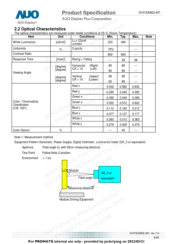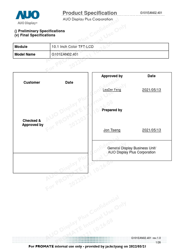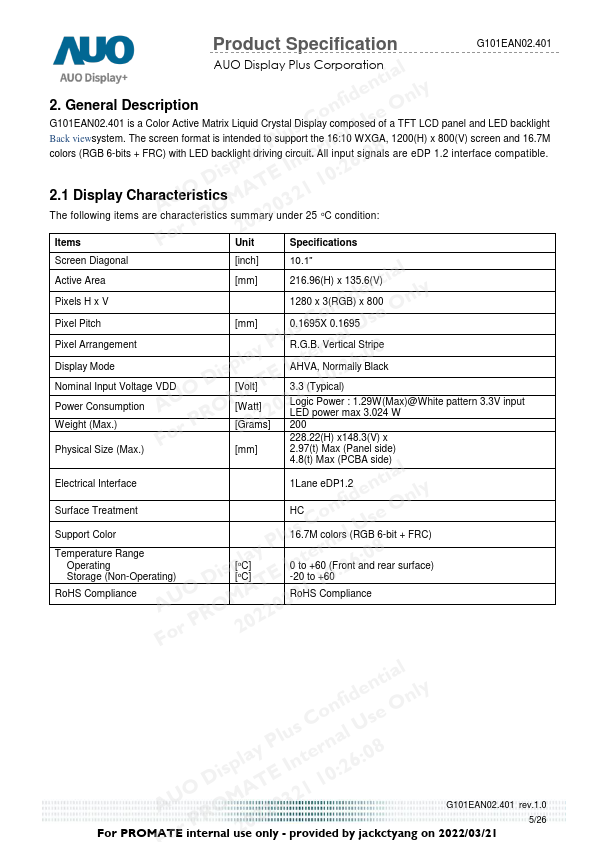 Co se G101EAN02.401 is a Color Active Matrix Liquid Crystal Display posed of a TFT LCD panel and LED backlight lus al U Back viewsystem. The screen format is intended to support the 16:10 WXGA, 1200(H) x 800(V) screen and 16.7M y P rn 8 colors (RGB 6-bits + FRC) with LED backlight driving circuit. All input signals are eDP 1.2 interface patible.