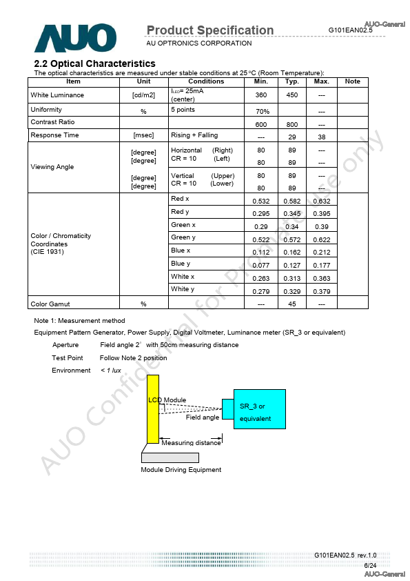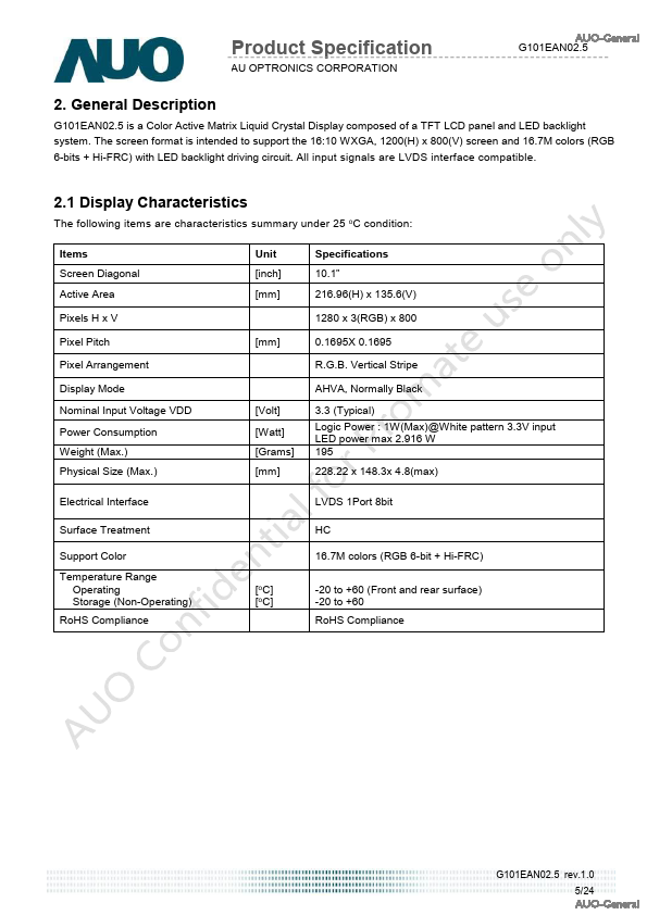 G101EAN02.5 is a Color Active Matrix Liquid Crystal Display posed of a TFT LCD panel and LED backlight system. The screen format is intended to support the 16:10 WXGA, 1200(H) x 800(V) screen and 16.7M colors (RGB 6-bits + Hi-FRC) with LED backlight driving circuit. All input signals are LVDS interface patible.