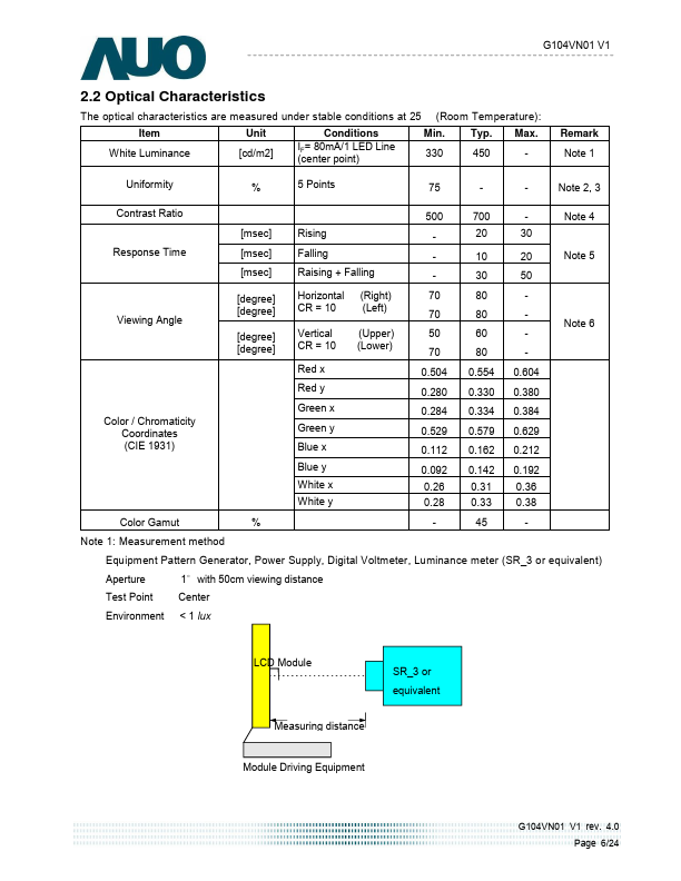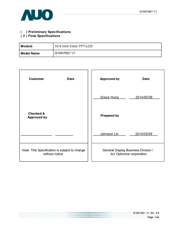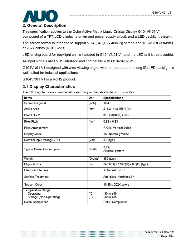 This specification applies to the Color Active Matrix Liquid Crystal Display G104VN01 V1 posed of a TFT-LCD display, a driver and power supply circuit, and a LED backlight system. The screen format is intended to support VGA (640(H) x 480(V)) screen and 16.2M (RGB 8-bits) or 262k colors (RGB 6-bits). LED driving board for backlight unit is included in G104VN01 V1 and the LED unit is replaceable.