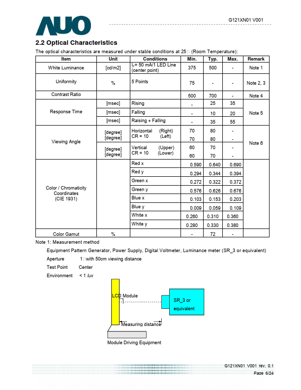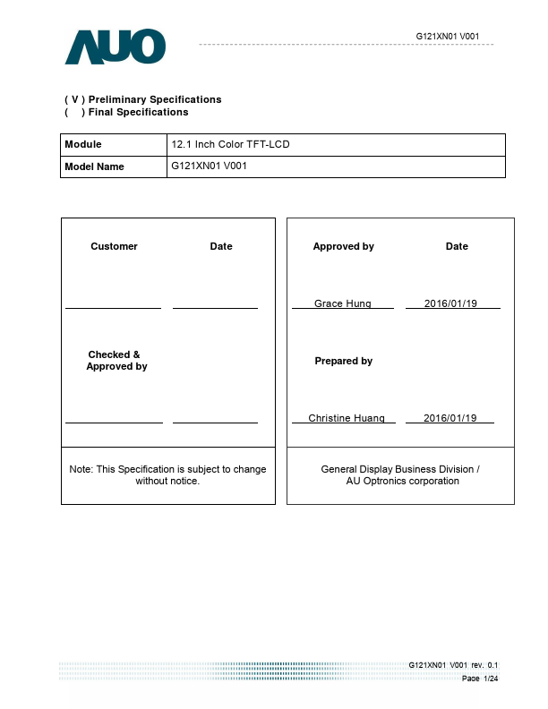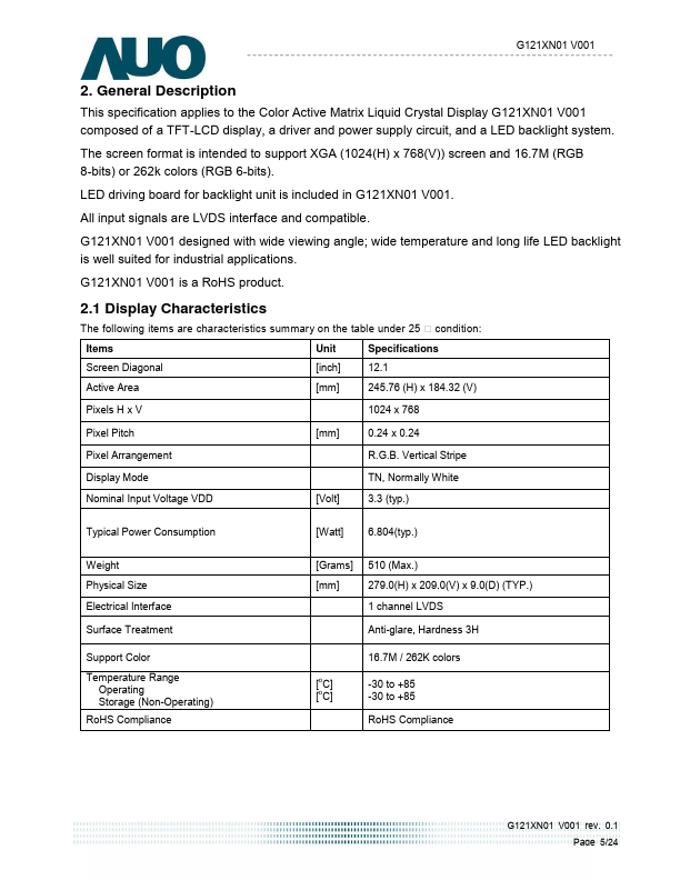 This specification applies to the Color Active Matrix Liquid Crystal Display G121XN01 V001 posed of a TFT-LCD display, a driver and power supply circuit, and a LED backlight system. The screen format is intended to support XGA (1024(H) x 768(V)) screen and 16.7M (RGB 8-bits) or 262k colors (RGB 6-bits). LED driving board for backlight unit is included in G121XN01 V001.