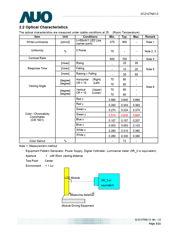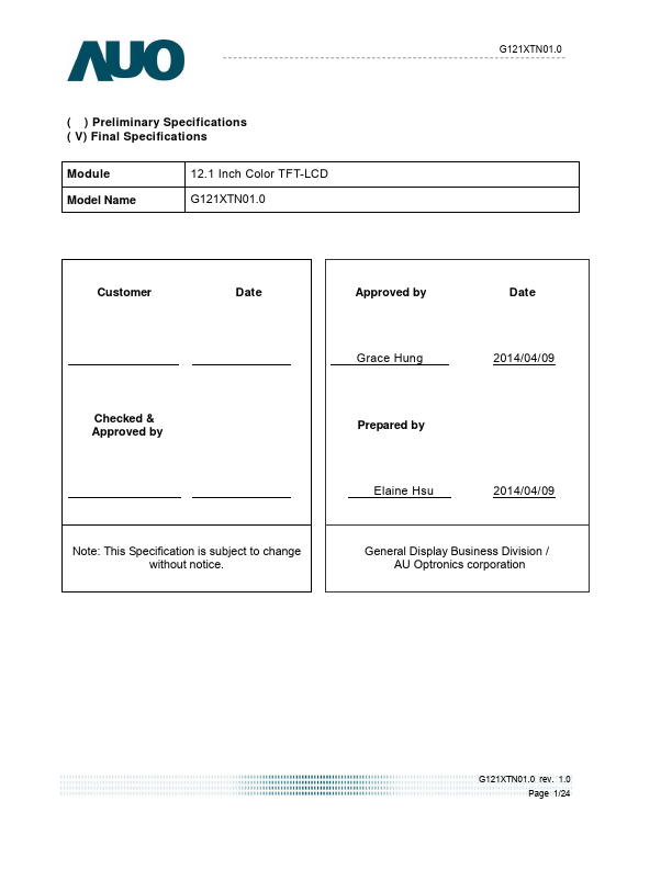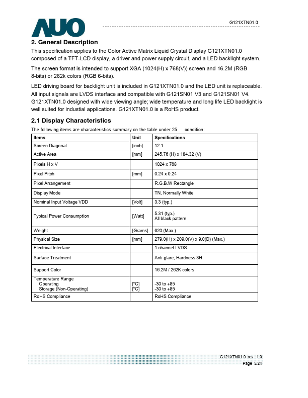 This specification applies to the Color Active Matrix Liquid Crystal Display G121XTN01.0 posed of a TFT-LCD display, a driver and power supply circuit, and a LED backlight system. The screen format is intended to support XGA (1024(H) x 768(V)) screen and 16.2M (RGB 8-bits) or 262k colors (RGB 6-bits). LED driving board for backlight unit is included in G121XTN01.0 and the LED unit is replaceable.