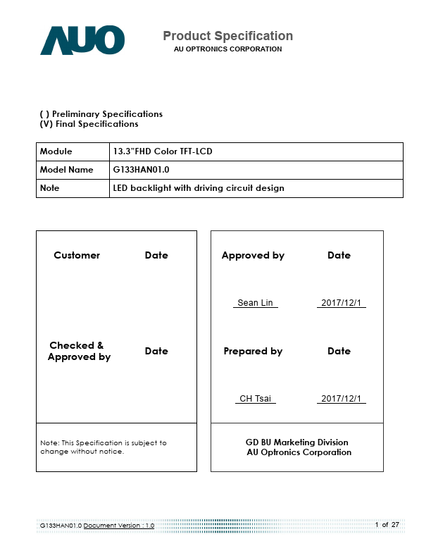 G133HAN01.0 is a Color Active Matrix Liquid Crystal Display posed of a TFT LCD panel, a driver circuit, and LED backlight system. The screen format is intended to support the 16:9 FHD, 1920(H) x1080(V) screen and 16.7M colors (RGB 8-bits data driver) with LED backlight driving circuit. G133HAN01.0 is designed for a display unit of industrial machine.