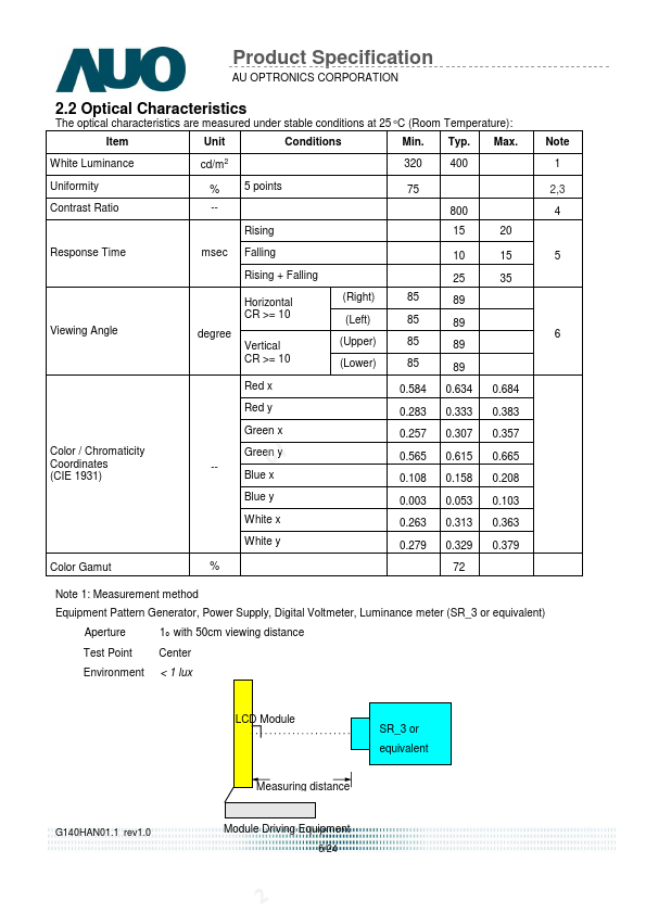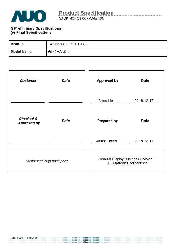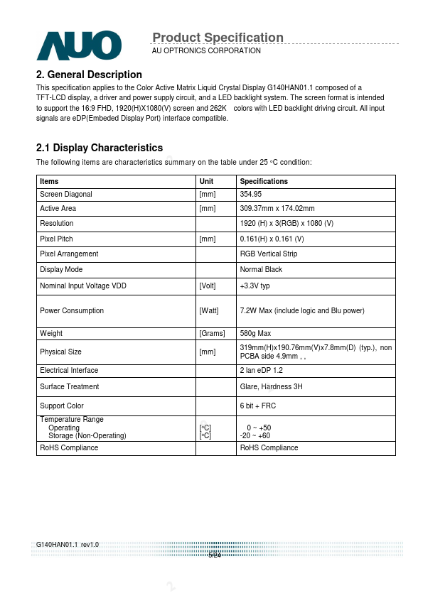 This specification applies to the Color Active Matrix Liquid Crystal Display G140HAN01.1 posed of a TFT-LCD display, a driver and power supply circuit, and a LED backlight system. The screen format is intended :4 to support the 16:9 FHD, 1920(H)X1080(V) screen and 262K colors with LED backlight driving circuit. All input signals are eDP(Embeded Display Port) interface patible.