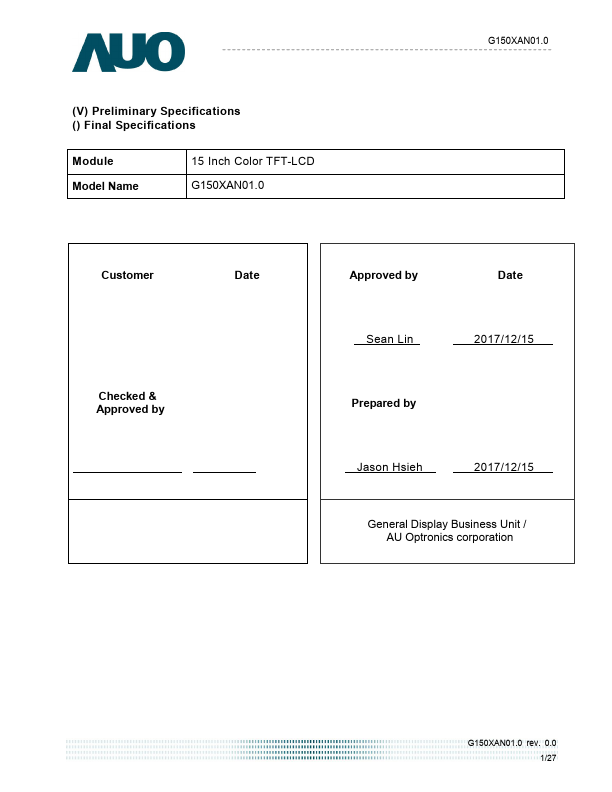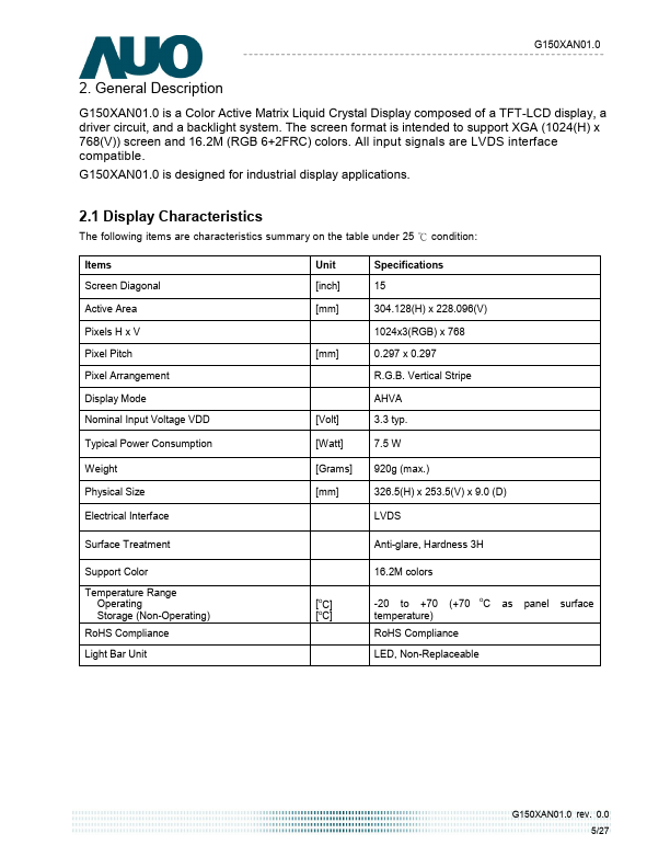 G150XAN01.0 is a Color Active Matrix Liquid Crystal Display posed of a TFT-LCD display, a driver circuit, and a backlight system. The screen format is intended to support XGA (1024(H) x 768(V)) screen and 16.2M (RGB 6+2FRC) colors. All input signals are LVDS interface patible.