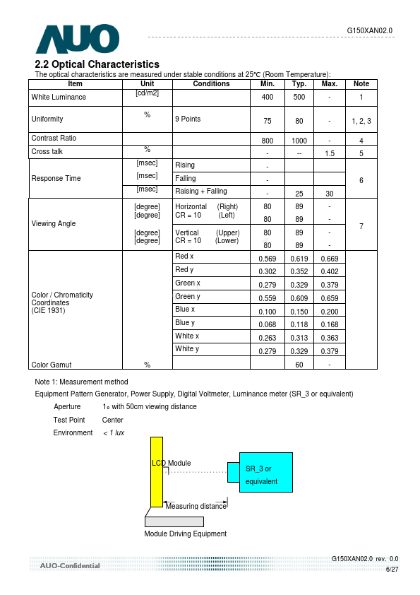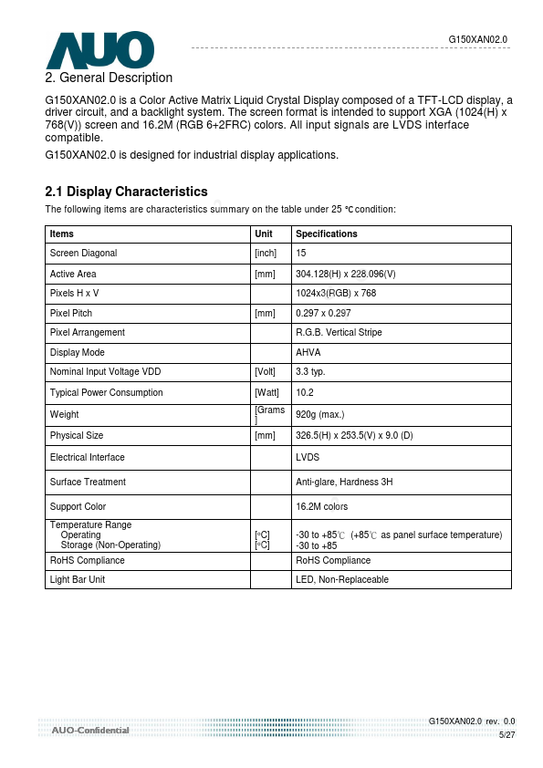 G150XG03 V G150XAN02.0 is a Color Active Matrix Liquid Crystal Display posed of a TFT-LCD display, a driver circuit, and a backlight system. The screen format is intended to support XGA (1024(H) x 768(V)) screen and 16.2M (RGB 6+2FRC) colors. All input signals are LVDS interface patible.