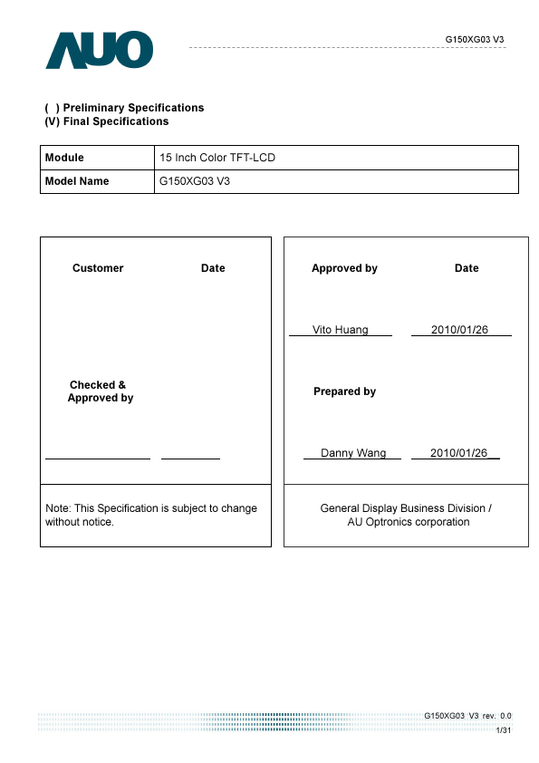 G150XG03 V3 is a Color Active Matrix Liquid Crystal Display posed of a TFT-LCD display, a driver circuit, and a backlight system. The screen format is intended to support XGA (1024(H) x 768(V)) screen and 16.2M (RGB 8-bits) coloars. All input signals are LVDS interface patible.