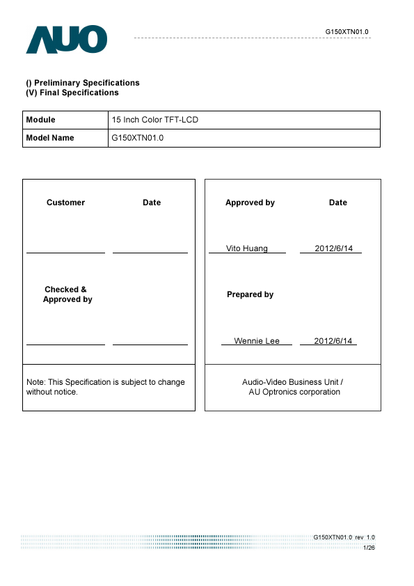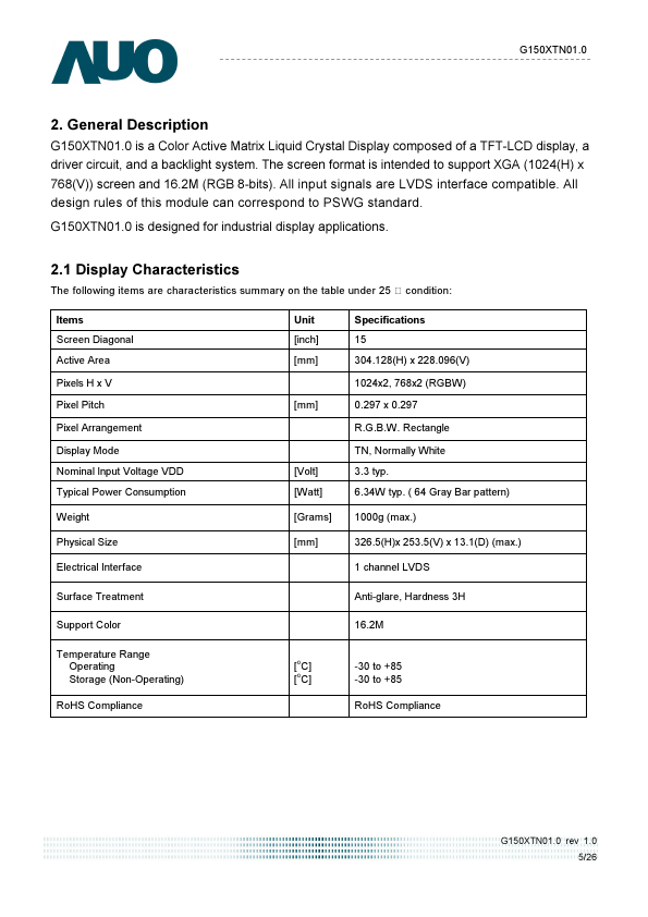 G150XTN01.0 is a Color Active Matrix Liquid Crystal Display posed of a TFT-LCD display, a driver circuit, and a backlight system. The screen format is intended to support XGA (1024(H) x 768(V)) screen and 16.2M (RGB 8-bits). All input signals are LVDS interface patible.