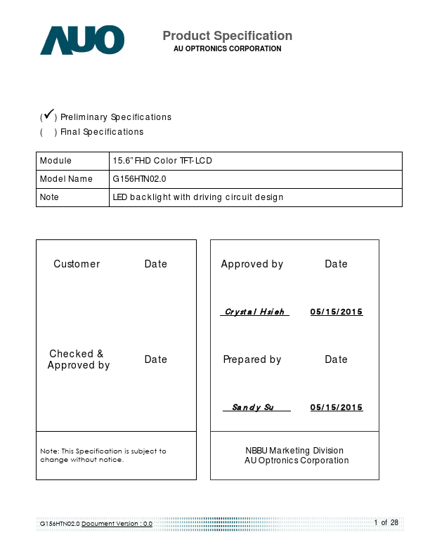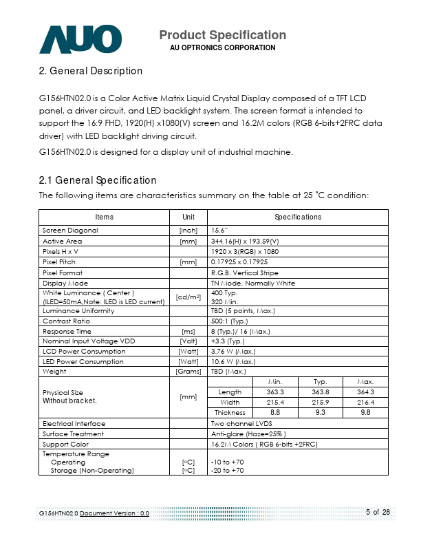 G156HTN02.0 is a Color Active Matrix Liquid Crystal Display posed of a TFT LCD panel, a driver circuit, and LED backlight system. The screen format is intended to support the 16:9 FHD, 1920(H) x1080(V) screen and 16.2M colors (RGB 6-bits+2FRC data driver) with LED backlight driving circuit. G156HTN02.0 is designed for a display unit of industrial machine.