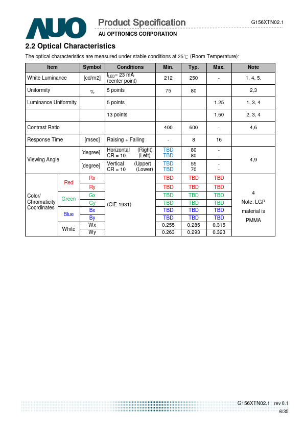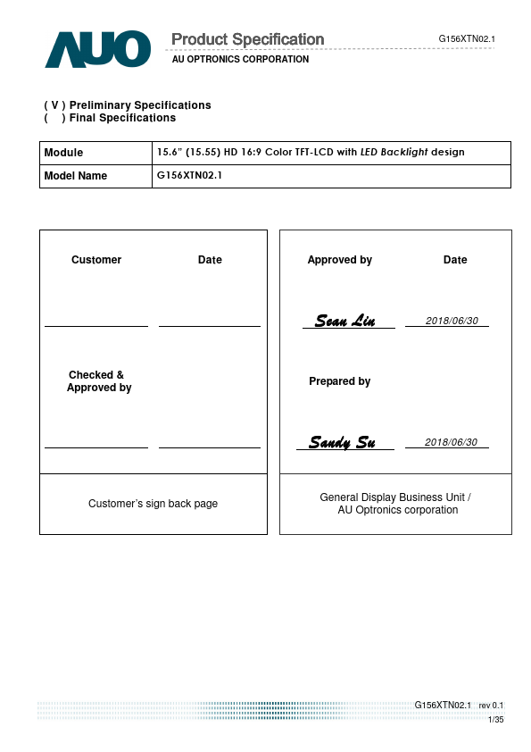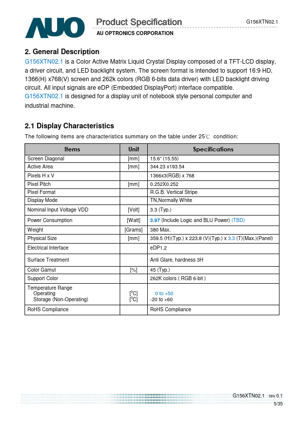 G156XTN02.1 is a Color Active Matrix Liquid Crystal Display posed of a TFT-LCD display, a driver circuit, and LED backlight system. The screen format is intended to support 16:9 HD, 1366(H) x768(V) screen and 262k colors (RGB 6-bits data driver) with LED backlight driving circuit. All input signals are eDP (Embedded DisplayPort) interface patible.