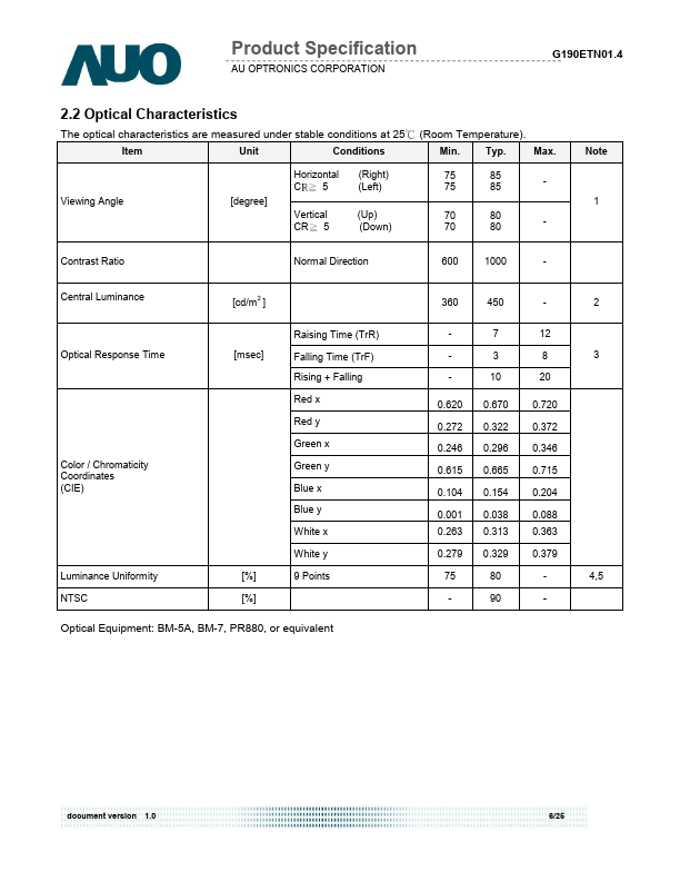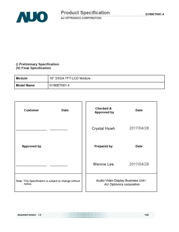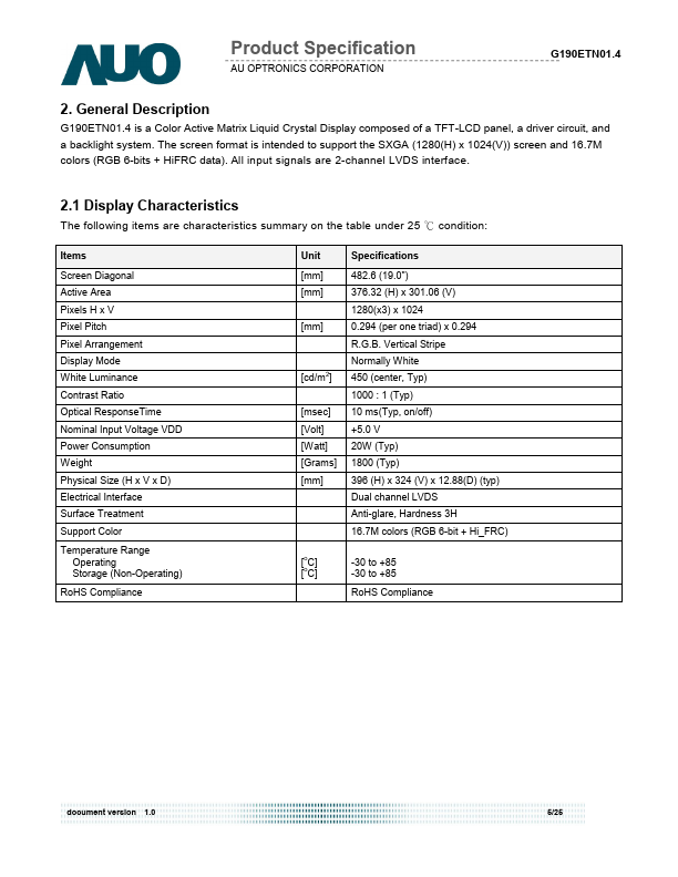 G190ETN01.4 is a Color Active Matrix Liquid Crystal Display posed of a TFT-LCD panel, a driver circuit, and a backlight system. The screen format is intended to support the SXGA (1280(H) x 1024(V)) screen and 16.7M colors (RGB 6-bits + HiFRC data). All input signals are 2-channel LVDS interface.