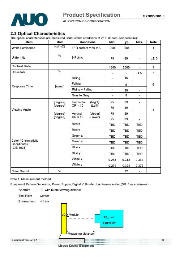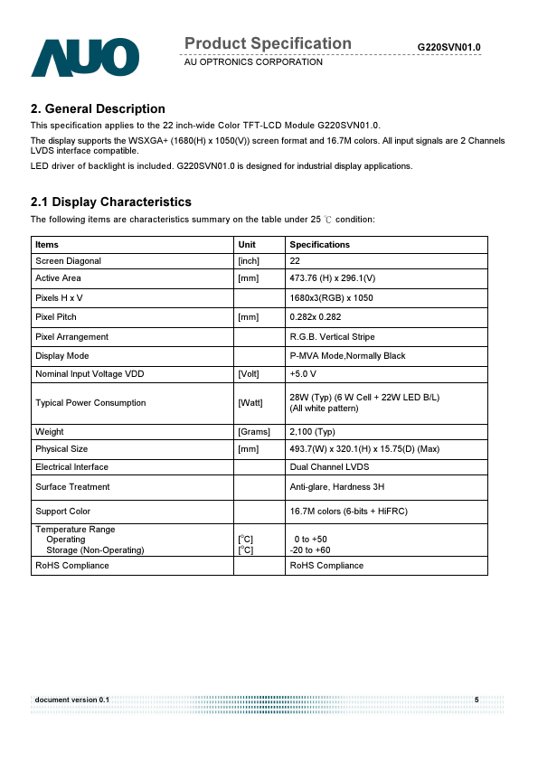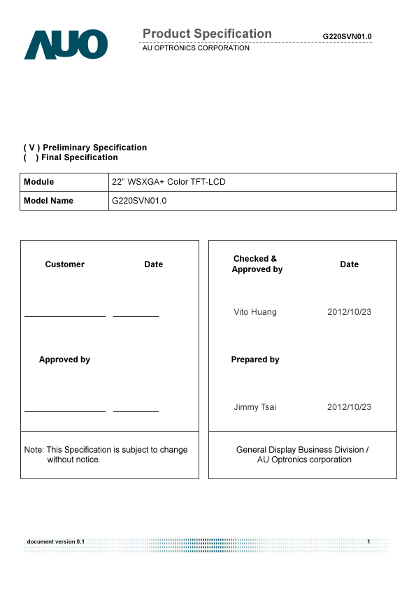 This specification applies to the 22 inch-wide Color TFT-LCD Module G220SVN01.0. The display supports the WSXGA+ (1680(H) x 1050(V)) screen format and 16.7M colors. All input signals are 2 Channels LVDS interface patible.