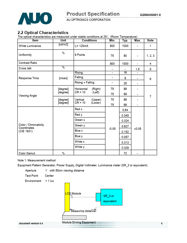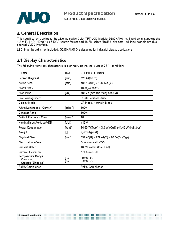 This specification applies to the 28.6 inch-wide Color TFT-LCD Module G286HAN01.0. The display supports the 1/2 of Full HD - 1920(H) x 540(V) screen format and 16.7M colors (RGB 8-bits data). All input signals are dual channel LVDS interface.
