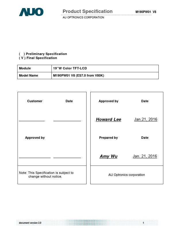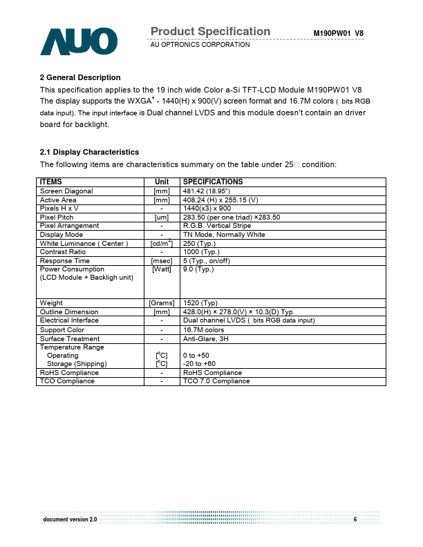 This specification applies to the 19 inch wide Color a-Si TFT-LCD Module M190PW01 V8 The display supports the WXGA+ - 1440(H) x 900(V) screen format and 16.7M colors (bits RGB data input). The input interface is Dual channel LVDS and this module doesn’t contain an driver board for backlight. 2.1 Display Characteristics The following items are characteristics summary on the table under 25 condition:.