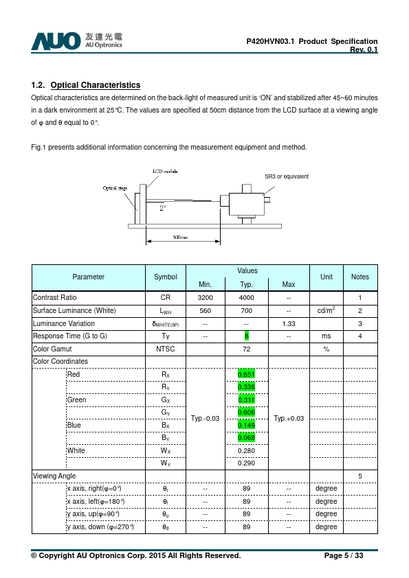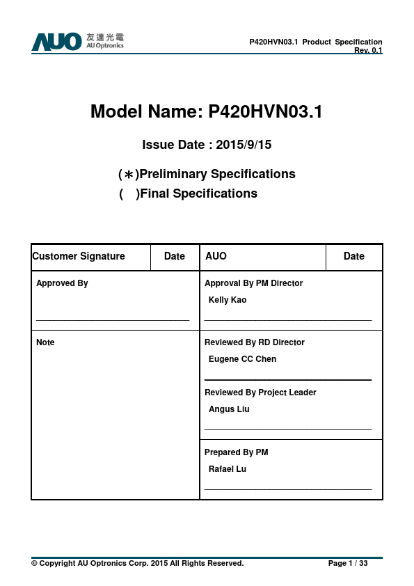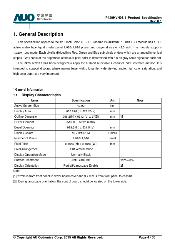 This specification applies to the 42.0 inch Color TFT-LCD Module P420HVN03.1. This LCD module has a TFT active matrix type liquid crystal panel 1,920x1,080 pixels, and diagonal size of 42.0 inch. This module supports 1,920x1,080 mode.