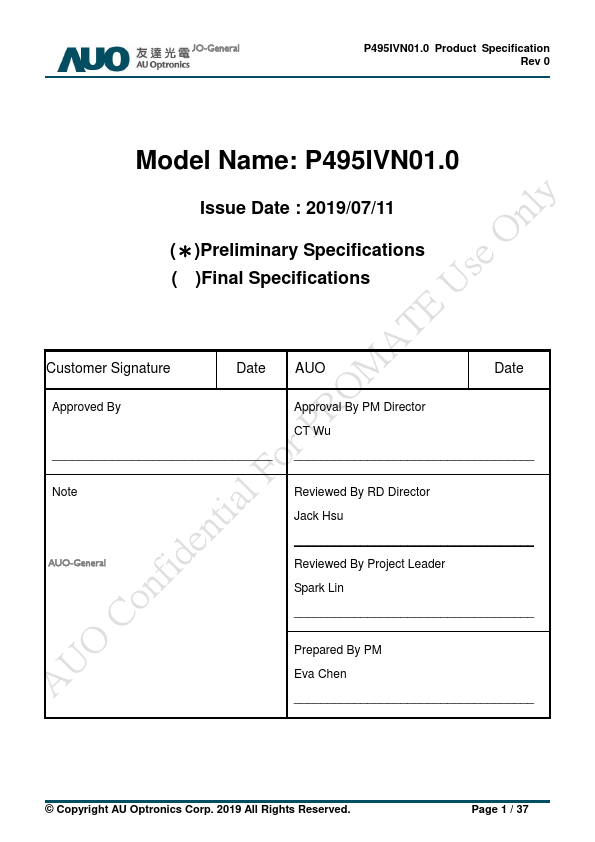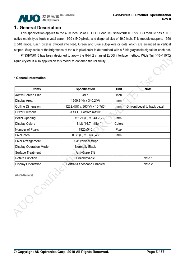 This specification applies to the 49.5 inch Color TFT-LCD Module P495IVN01.0. This LCD module has a TFT active matrix type liquid crystal panel 1920 x 540 pixels, and diagonal size of 49.5 inch. This module supports 1920 x 540 mode.