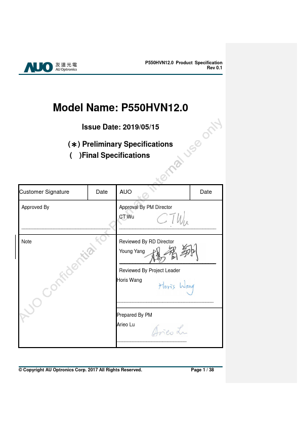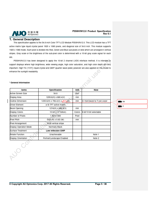 This specification applies to the 54.6 inch Color TFT-LCD Module P550HVN12.0. This LCD module has a TFT active matrix type liquid crystal panel 1920 x 1080 pixels, and diagonal size of 54.6 inch. This module supports 1920 x 1080 mode.