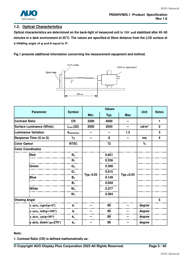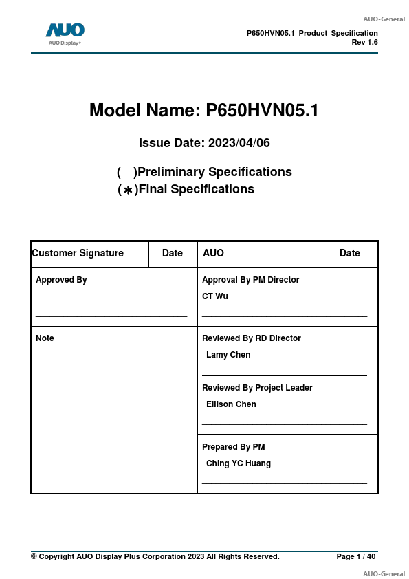 This specification applies to the 65 inch Color TFT-LCD Module P650HVN05.1. This LCD module has a TFT active matrix type liquid crystal panel 1920x1080 pixels, and diagonal size of 64.5 inch. This module supports 1920x1080 mode.