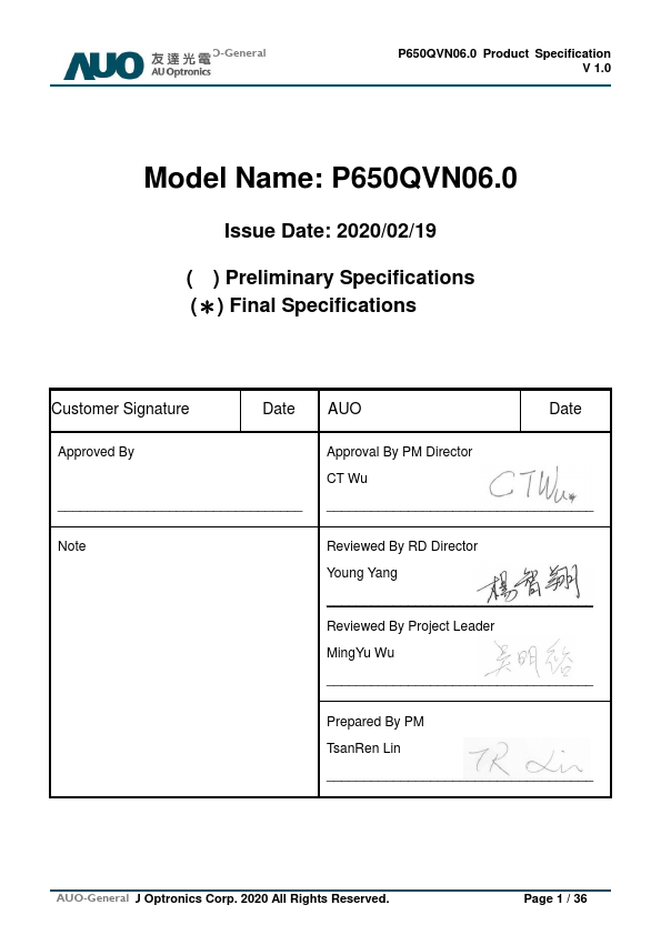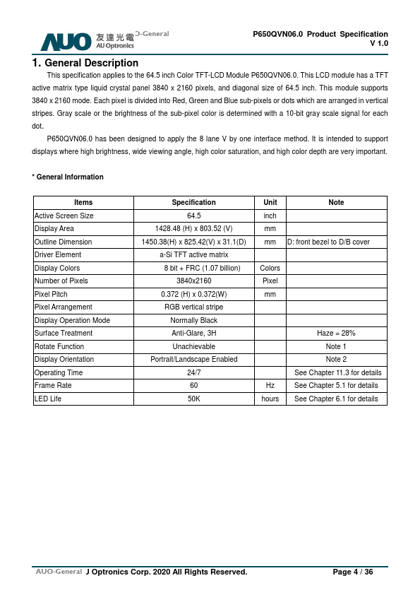 This specification applies to the 64.5 inch Color TFT-LCD Module P650QVN06.0. This LCD module has a TFT active matrix type liquid crystal panel 3840 x 2160 pixels, and diagonal size of 64.5 inch. This module supports 3840 x 2160 mode.