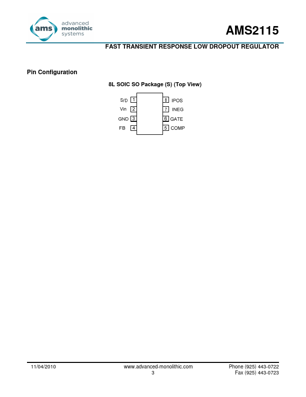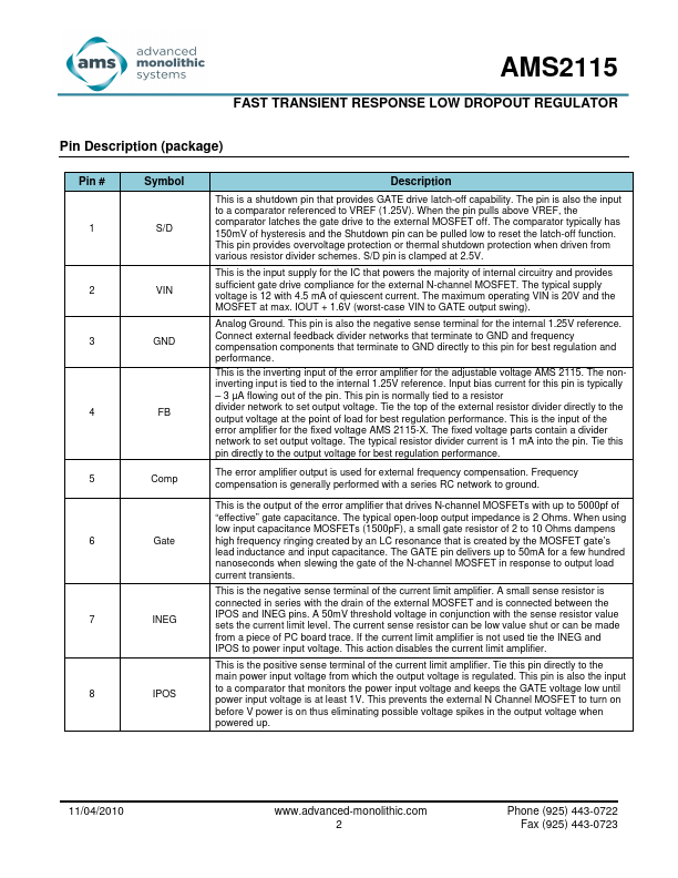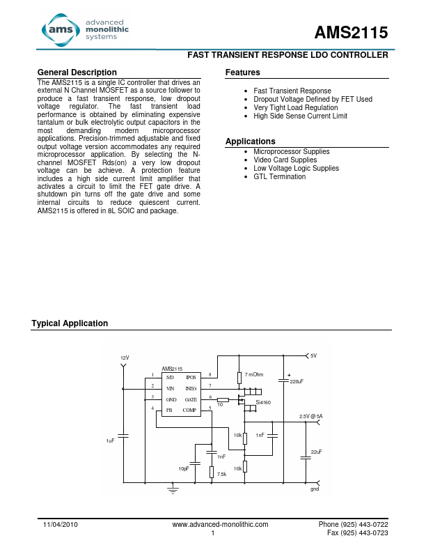 The AMS2115 is a single IC controller that drives an external N Channel MOSFET as a source follower to produce a fast transient response, low dropout voltage regulator.