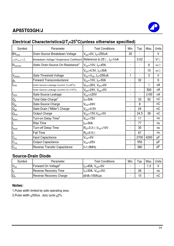 The TO-252 package is universally preferred for all mercialindustrial surface mount applications and suited for low voltage applications such as DC/DC converters. The through-hole version (AP85T03GJ) is available for low-profile applications. Value 1.4 110 Units ℃/W ℃/W Data & specifications subject to change without notice 200823053-1/4 AP85T03GH/J @Tj=25oC(unless otherwise specified) Symbol Parameter Test...