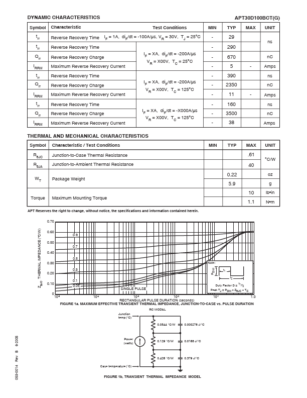1000V 2x30A APT30D100BCT ® APT30D100BCTG G Denotes RoHS pliant, Pb Free Terminal Finish. ULTRAFAST SOFT RECOVERY RECTIFIER DIODE PRODUCT APPLICATIONS Anti-Parallel Diode -Switchmode Power Supply -Inverters Free Wheeling Diode -Motor Controllers -Converters -Inverters Snubber Diode PFC PRODUCT.