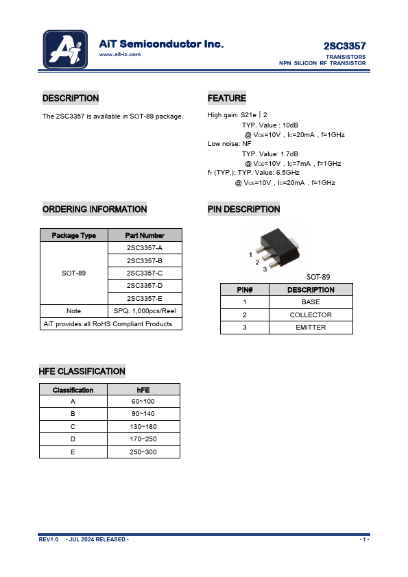 ORDERING INFORMATION Package Type Part Number 2SC3357-A 2SC3357-B SOT-89 2SC3357-C 2SC3357-D 2SC3357-E Note SPQ: 1,000pcs/Reel AiT provides all RoHS Compliant Products