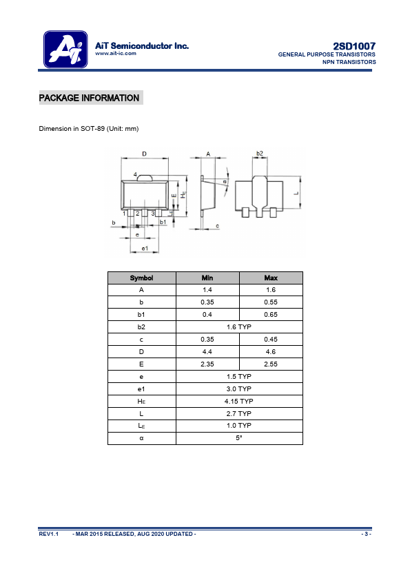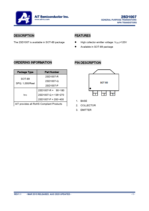 AiT Semiconductor Inc. www.ait-ic.com 2SD1007 GENERAL PURPOSE TRANSISTORS NPN TRANSISTORS DESCRIPTION The 2SD1007 is available in SOT-89 package FEATURES High collector...