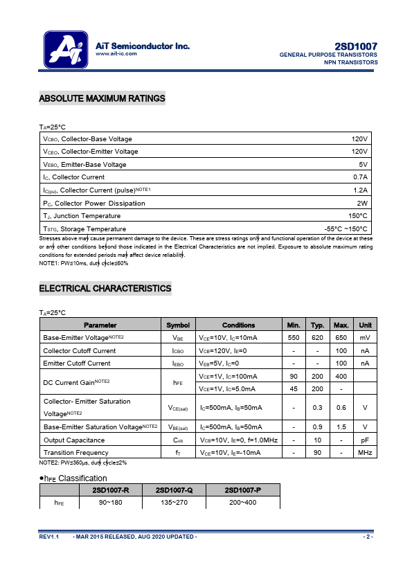 N The 2SD1007 is available in SOT-89 package FEATURES High collector emitter voltage: VCEO>120V Available in SOT-89 package ORDERING INFORMATION Package Type Part Number SOT-89 SPQ: 1,000/Reel 2SD1007-R 2SD1007-Q 2SD1007-P 2SD1007-R = 90~180 hFE 2SD1007-Q = 135~270 2SD1007-P = 200~400 AiT provides all RoHS Compliant Products PIN DESCRIPTION 1. BASE 2. COLLECTOR 3. EMITTER REV1.1 - MAR 2015 RELEASED, AUG 2020 UPDATED - -1- AiT Semiconductor Inc. www.ait-ic.