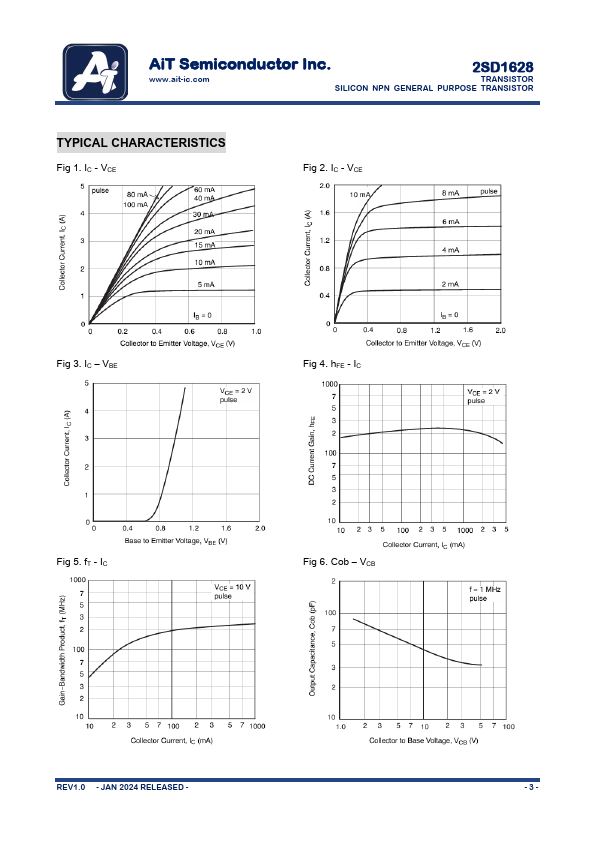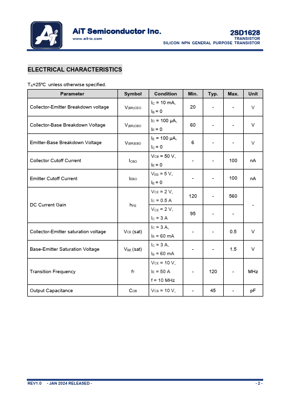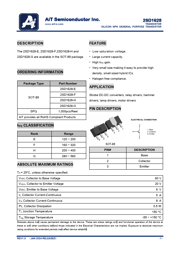 AiT Semiconductor Inc. 2SD1628 www.ait-ic.com TRANSISTOR SILICON NPN GENERAL PURPOSE TRANSISTOR DESCRIPTION FEATURE The 2SD1628-E, 2SD1628-F,2SD1628-H and 2SD1628-G are a...