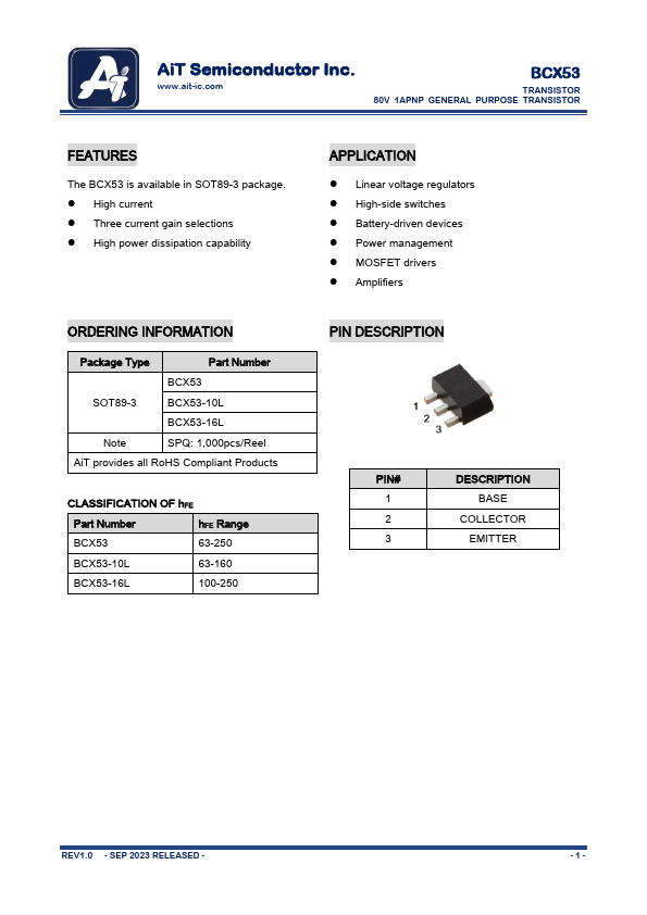 Overview: AiT Semiconductor Inc. www.ait-ic.com BCX53 TRANSISTOR 80V 1APNP GENERAL PURPOSE.