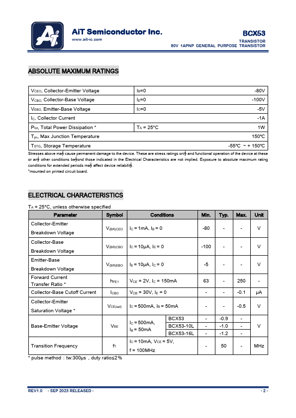Overview: AiT Semiconductor Inc. www.ait-ic.com BCX53 TRANSISTOR 80V 1APNP GENERAL PURPOSE.