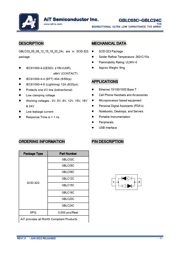 GBLC03_05_08_12_15_18_20_24c are in SOD-323 ⚫ SOD-323 Package package. ⚫ Solder Reflow Temperature: 260oC/10s ⚫ Flammability Rating:.
