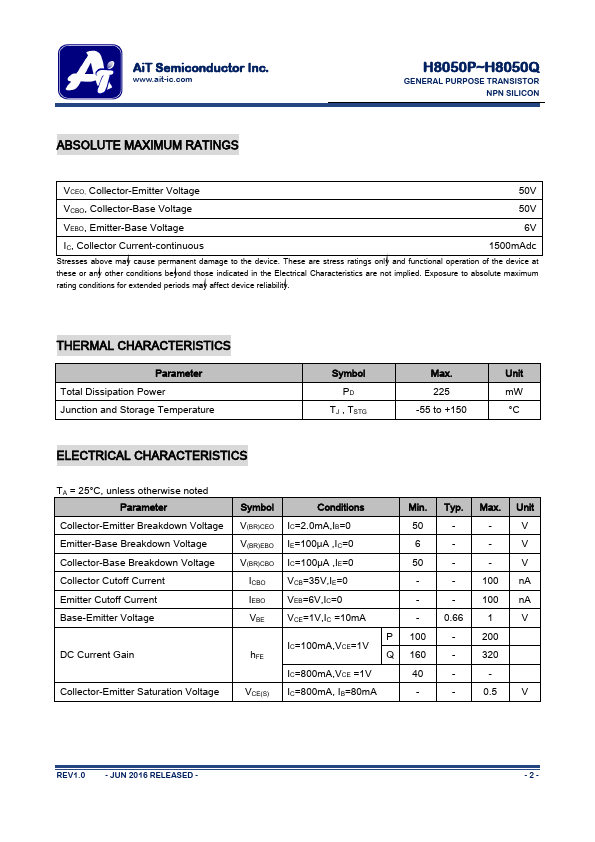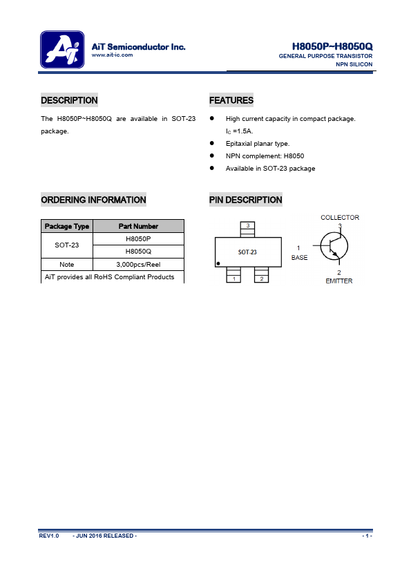 Overview: AiT Semiconductor Inc. www.ait-ic.com H8050P~H8050Q GENERAL PURPOSE TRANSISTOR NPN.