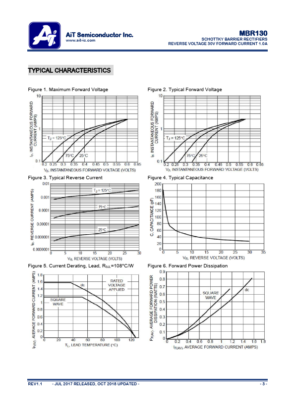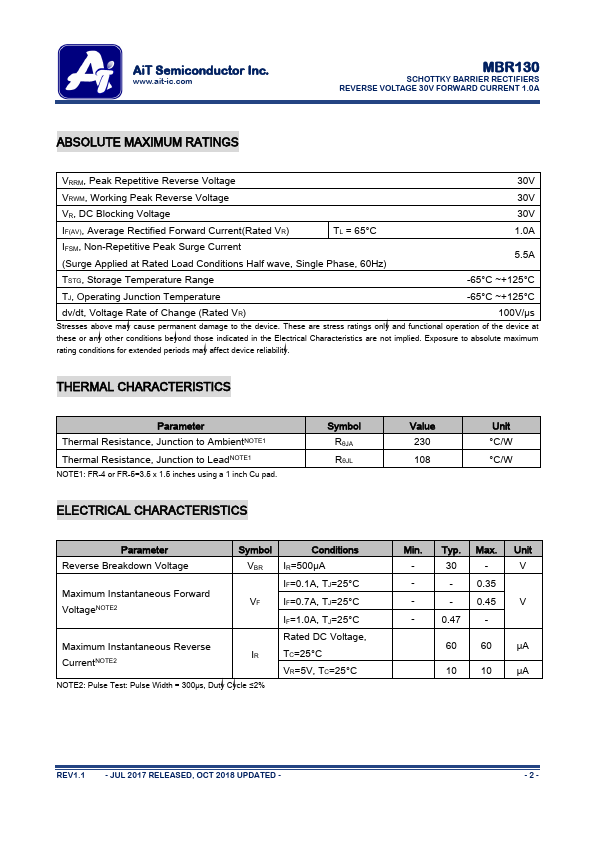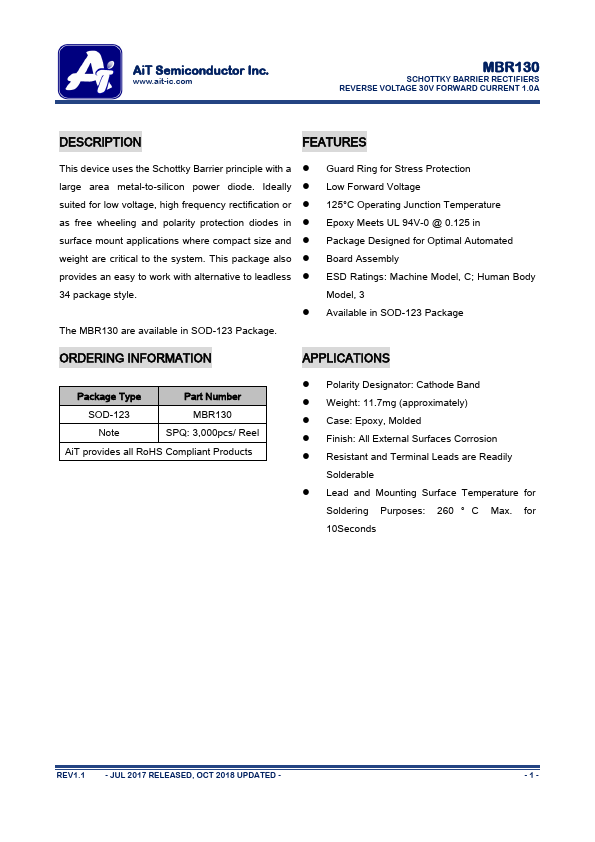 Overview: AiT Semiconductor Inc. .ait-ic. MBR130 SCHOTTKY BARRIER RECTIFIERS REVERSE VOLTAGE 30V FORWARD CURRENT 1.