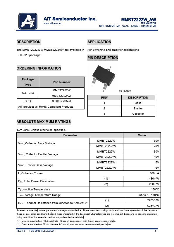 PIN DESCRIPTION ORDERING INFORMATION Package Type Part Number SOT-323 MMBT2222W MMBT2222AW SPQ 3,000pcs/Reel AiT provides all RoHS Compliant Products PIN# 1 2 3 SOT-323 DESCRIPTION Base Emitter Collector ABSOLUTE MAXIMUM RATINGS TA = 25°C, unless otherwise specified.