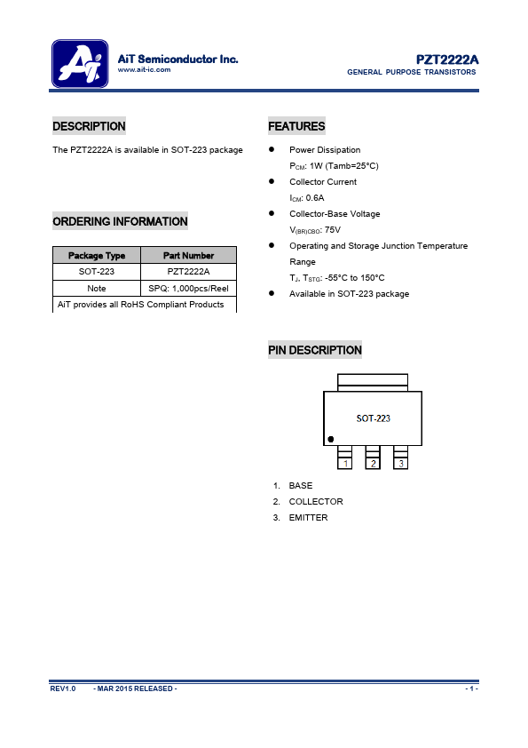 The PZT2222A is available in SOT-223 package ORDERING INFORMATION Package Type Part Number SOT-223 PZT2222A Note SPQ: 1,000pcs/Reel AiT provides all RoHS Compliant Products