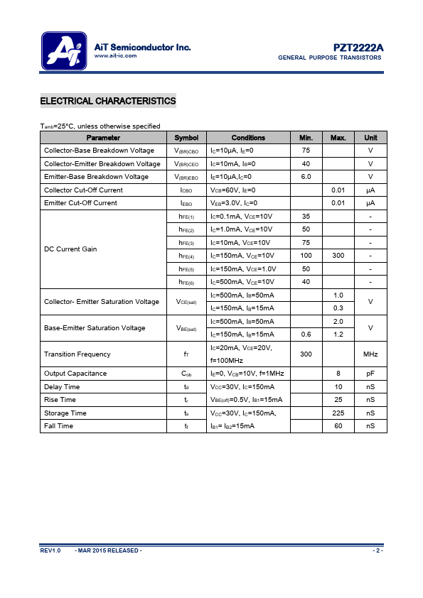 Overview: AiT Semiconductor Inc. www.ait-ic.com PZT2222A GENERAL PURPOSE.
