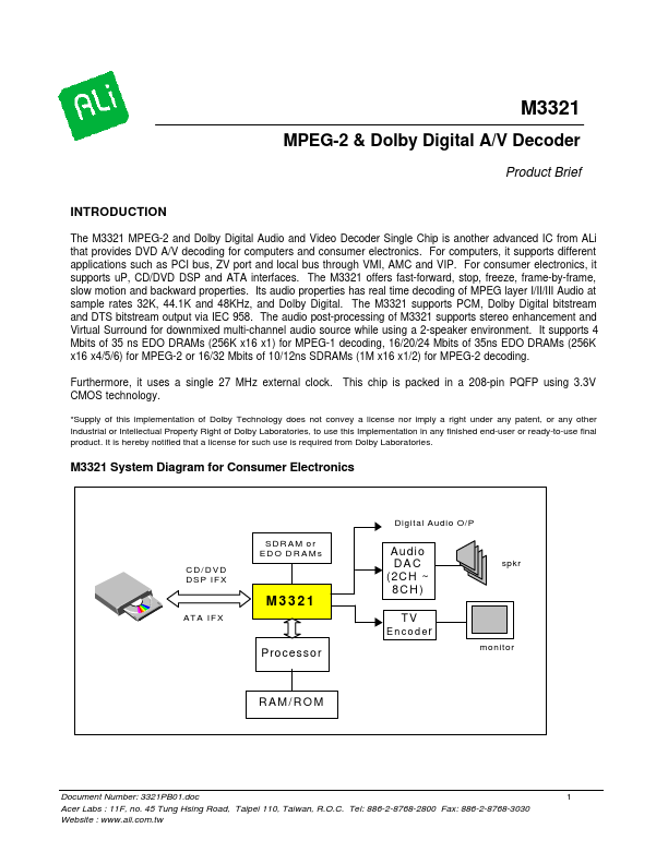 The M3321 MPEG-2 and Dolby Digital Audio and Video Decoder Single Chip is another advanced IC from ALi that provides DVD A/V decoding for puters and consumer electronics.