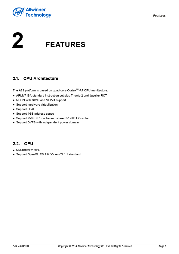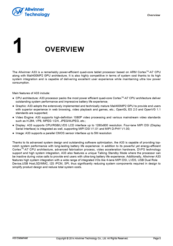 Allwinner A33 Datasheet Quad Core Tablet Processor V ersion : S ep 22, 2014 Copyright © 2014 Allwinner Technology Co., Ltd. Overview 1 OVERVIEW The Allwinner A33 is a remarkably power-efficient quad-core tablet processor based on ARM CortexTM-A7 CPU along with Mali400MP2 GPU architecture.