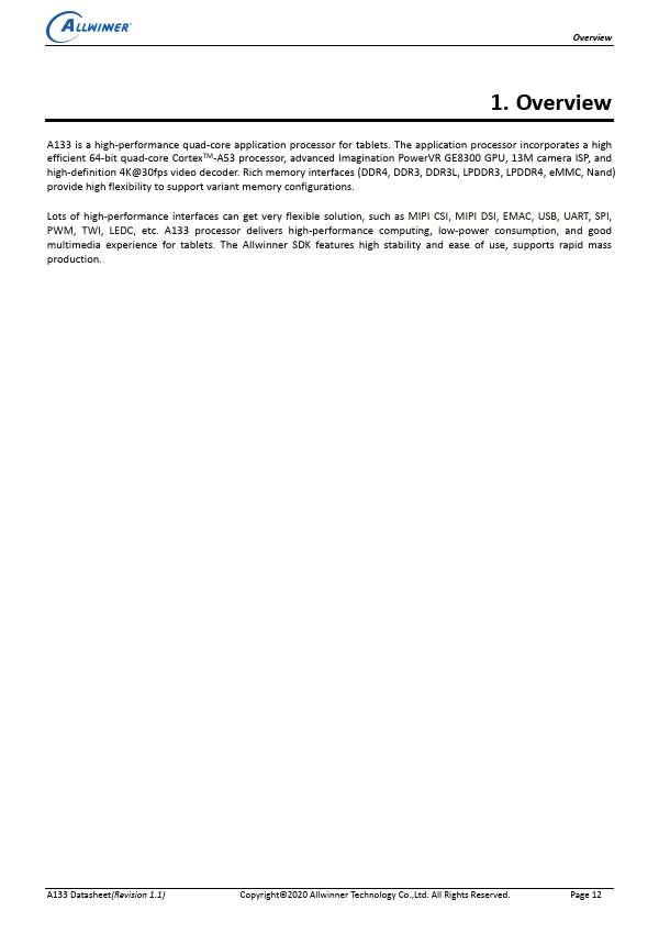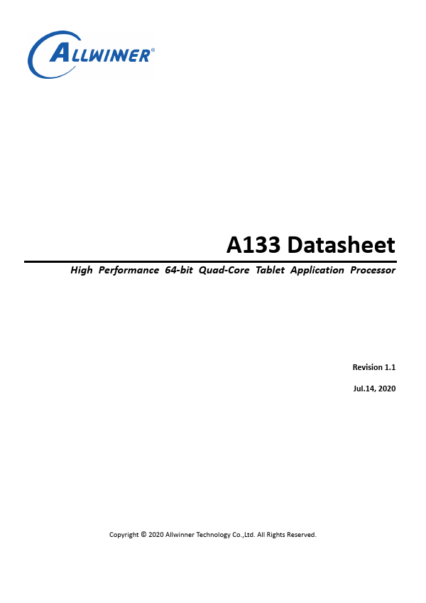 A133 Datasheet High Performance 64-bit Quad-Core Tablet Application Processor Revision 1.1 Jul.14, 2020 Copyright © 2020 Allwinner Technology Co.,Ltd. Overview A133 is a high-performance quad-core application processor for tablets. The application processor incorporates a high efficient 64-bit quad-core CortexTM-A53 processor, advanced Imagination PowerVR GE8300 GPU, 13M camera ISP, and high-definition 4K@30fps...