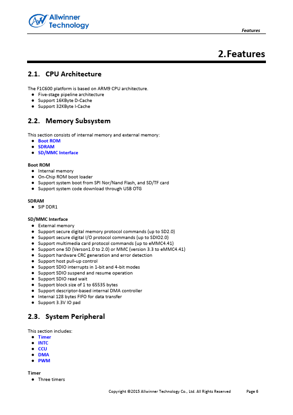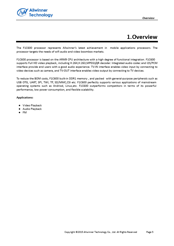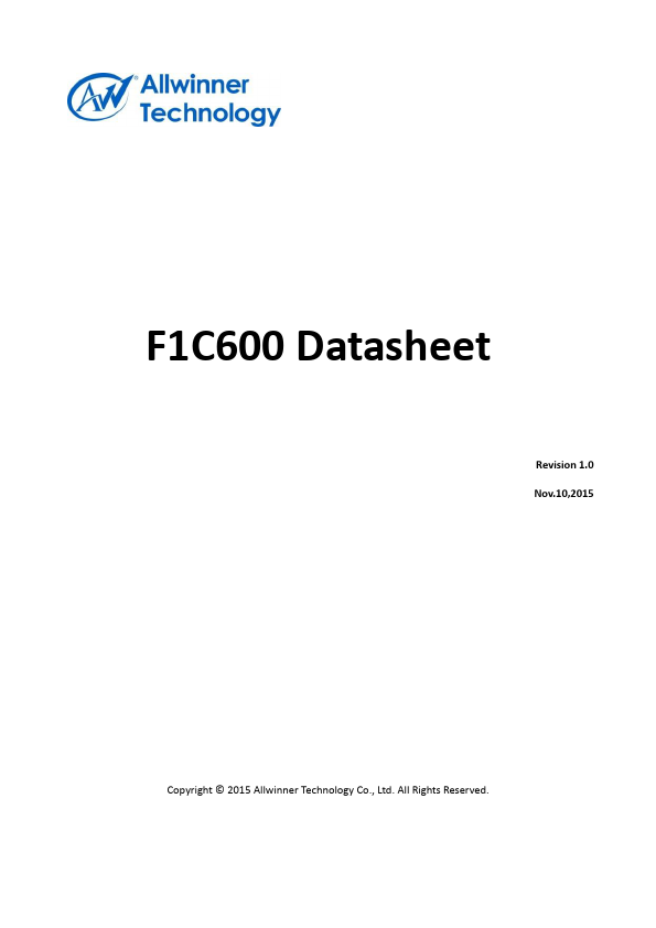 F1C600 Datasheet Revision 1.0 Nov.10,2015 Copyright © 2015 Allwinner Technology Co., Ltd. Overview The F1C600 processor represents Allwinner’s latest achievement in mobile applications processors. The processor targets the needs of wifi audio and video boombox markets.