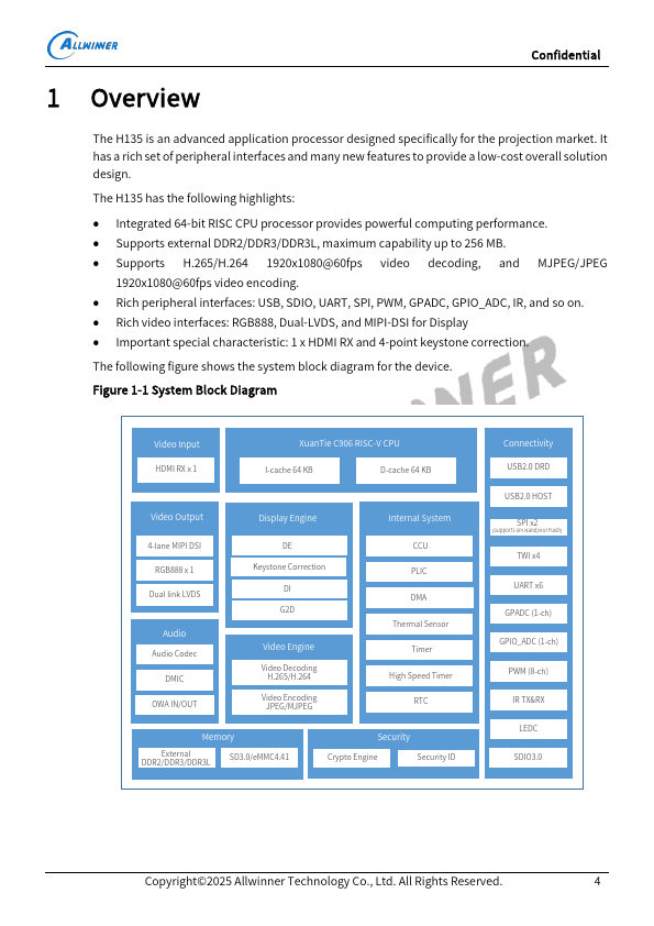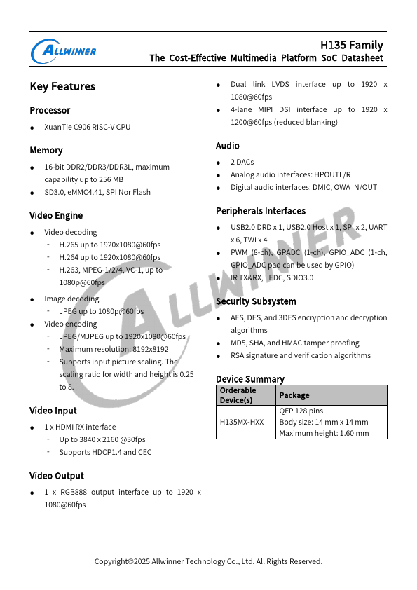 H135 Family The Cost-Effective Multimedia Platform SoC Datasheet.