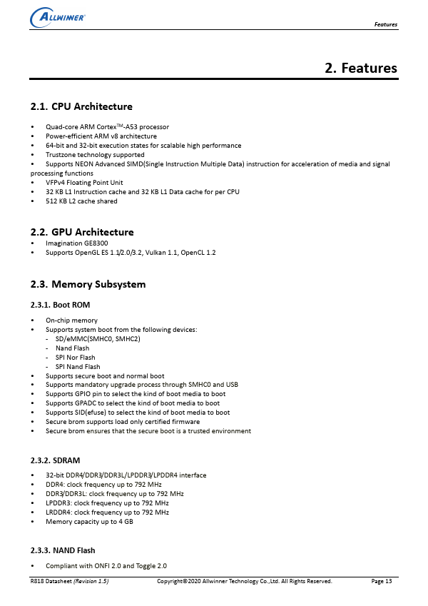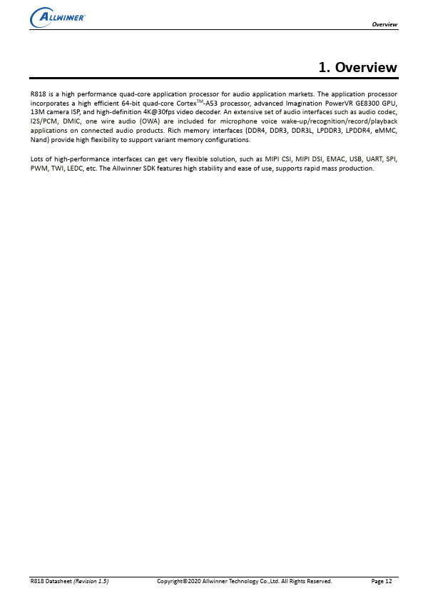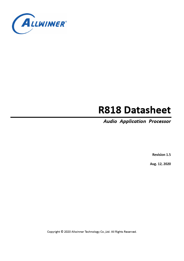 R818 Datasheet Audio Application Processor Revision 1.5 Aug. 12, 2020 Copyright © 2020 Allwinner Technology Co.,Ltd. Overview R818 is a high performance quad-core application processor for audio application markets.