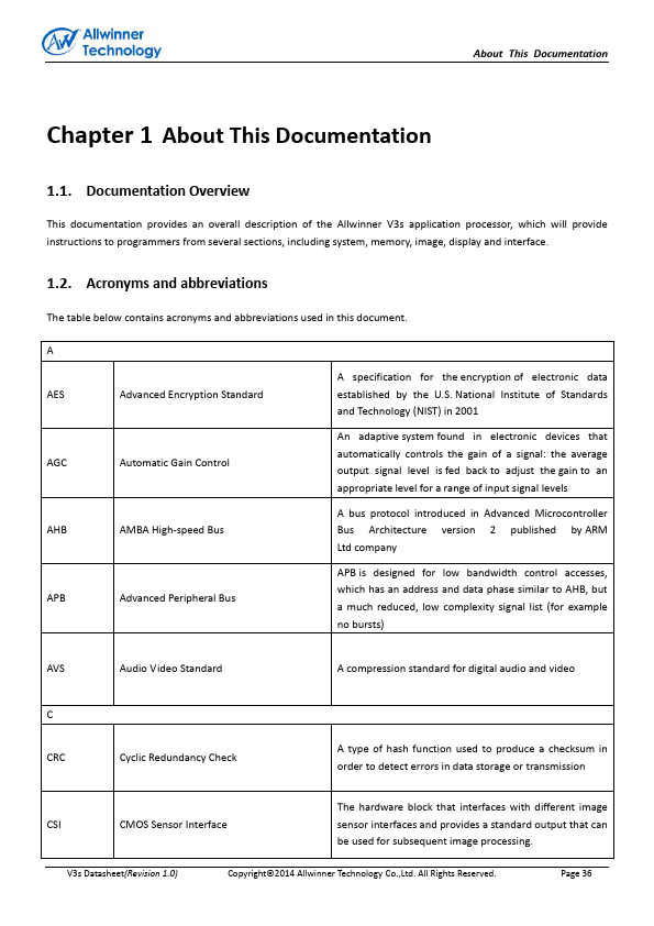 of the Allwinner V3s application processor, which will provide instructions to programmers from several sections, including system, memory, image, display and interface. Acronyms and abbreviations The table below contains acronyms and abbreviations used in this document. A AES Advanced Encryption Standard AGC Automatic Gain Control AHB AMBA High-speed Bus APB Advanced Peripheral Bus A specification for the...